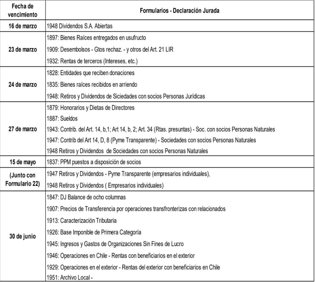 Como es habitual en nuestra oficina y dado los cambios del calendario de Declaraciones Juradas -DJ-, complementarias del proceso de Operación Renta Anual, en base a las instrucciones emanadas del Servicio de Impuestos Internos, hemos preparado un cuadro que resume en orden cronológico, fecha y DJ a presentar por el próximo AT 2026, que estimamos afectan a nuestra cartera de clientes y corresponden a las siguientes: